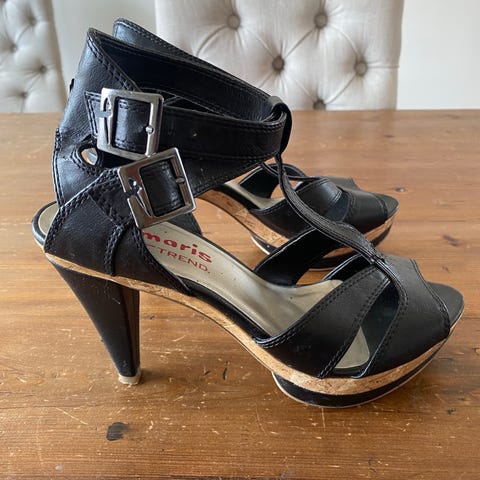 Mörkgrå sandaletter med öppen tå i skinn från &other stories. Strl 36. Klack ca 11 cm och framtill ca 3 cm.
