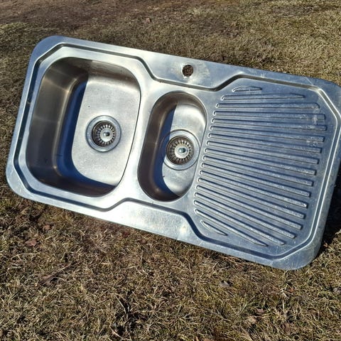 Diskho med dubbla hoar i rostfritt stål. En större och en mindre ho med avrinningshål. Passar för inbyggnad i köksbänk eller arbetsbänk där man önskar två separata hoar för disk och sköljning. Materialet i rostfritt stål är vanligt i kök och är anpassat för daglig användning med vatten och rengöringsmedel.