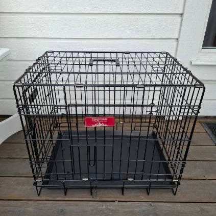Svart ihopfällbar hundbur i metall med löstagbar plastbotten. Burens konstruktion består av metallgaller med handtag upptill och dörr på sidan. Den kan fällas ihop för enklare förvaring och transport. Passar för hund eller annat husdjur i lämplig storlek. Mått enligt tabell på bild (large): längd, bredd och höjd anges i centimeter för olika storlekar.