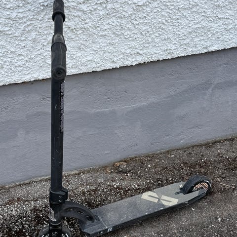 X-Treme sparkcykel i svart med gröna detaljer. Modellen har T-format styre med grepp i gummi och en robust fotplatta med hålmönster. Hjulen är små och hårda, anpassade för körning på hårda underlag. Passar för användning på exempelvis gångvägar, gårdsplan eller enklare trickåkning beroende på åkarens nivå. Måttstock på bilderna ger en ungefärlig uppfattning om höjd på styre och längd på fotplatta.