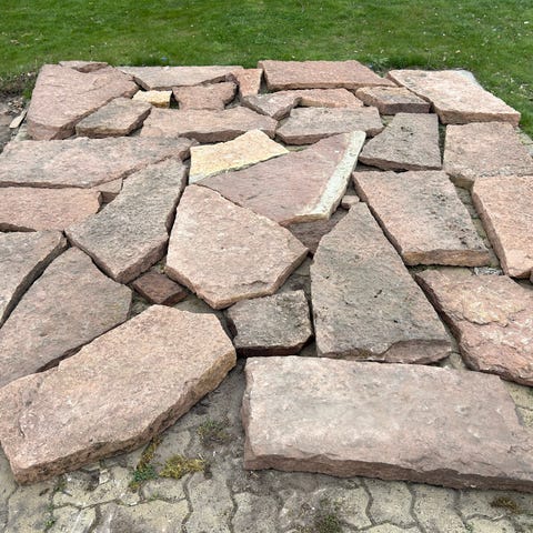 Röd ölandssten säljes, har täckt ca 20 m2 i trädgården.