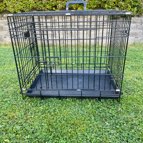 Begagnad hundbur i aluminium med bruna skivor. Bur med sluttande sidor anpassad för placering i bilens bagageutrymme. Gallerfront med dörr och låsanordning samt ventilerande galler på sidorna. Stabil konstruktion med ram i aluminium och täta skivor på sidor, bakstycke och tak. Lämplig för transport och förvaring av hund i bil.