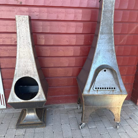 Fristående trädgårdskamin i stål med rostbrun yta. Hög, konformad modell med öppning framtill för vedeldning. Avsedd för användning utomhus på altan, uteplats eller i trädgård. Placeras på plant och brandsäkert underlag.