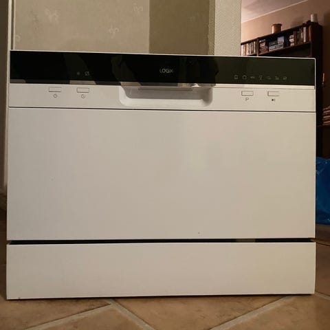 elvita diskmaskin av typen bänkdiskmaskin i vit färg. Modellen är fristående och kompakt, anpassad för placering på bänk eller i mindre utrymmen. Invändigt finns över- och underkorg för porslin, glas och bestick samt slangar för vattenanslutning och avlopp. Fronten har elektronisk panel med display och programknappar för val av diskprogram och funktioner. Passar för användning i kök där det behövs en mindre, fristående disklösning. rätt så ny!