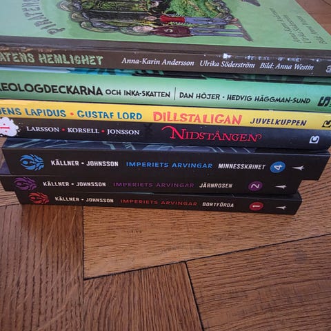 Paket med blandade barn- och ungdomsböcker i svensk text. Titlarna inkluderar bland annat "Skolmysteriet" ur serien LasseMajas detektivbyrå, en bok om scenskräck och en hemlig beundrare samt ytterligare ungdomsböcker med olika teman. Passar för läsare i skolåldern som vill ha varierad läsning inom spänning och vardagsberättelser.