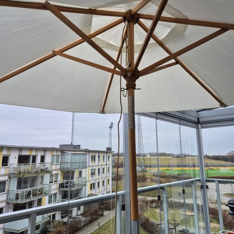 IKEA Parasoll fristående med vit duk och grå stativkonstruktion. Parasollfoten består av fyra separata vikter som omger stolpen för stabilitet. Duken är ljus och omsluter stativet när parasollet är hopfällt. Passar för användning på uteplats, altan eller trädgård där man önskar skugga över sittgrupp eller loungeområde.