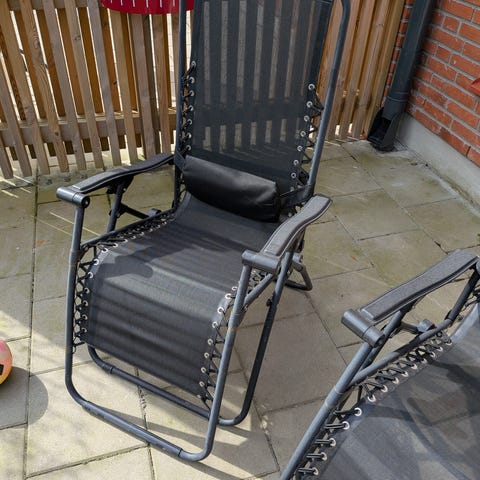 Solstolar recliner med blå sits och ryggstöd i textil och svart metallstomme. Stolarna är fällbara och har justerbar lutning för avslappnad sitt- och viloposition. Utrustade med avtagbara huvudkuddar. Passar för användning på altan, uteplats eller trädgård.