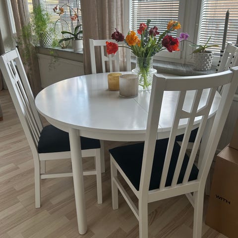 Rund matbord med 4 stolar. Några små repor på bordet och stolarna.