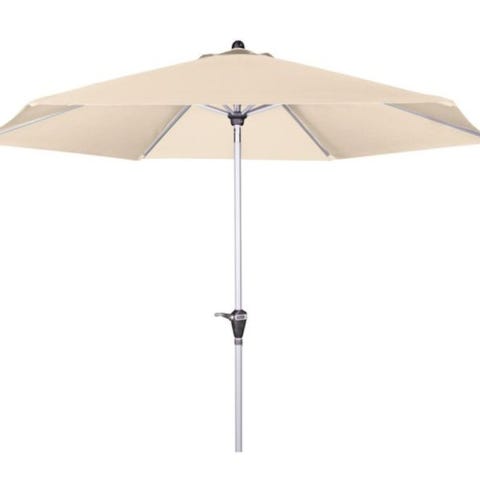 Smidigt vinkelbart parasoll i ljusbeige tyg i polyester. Perfekt för balkongen.