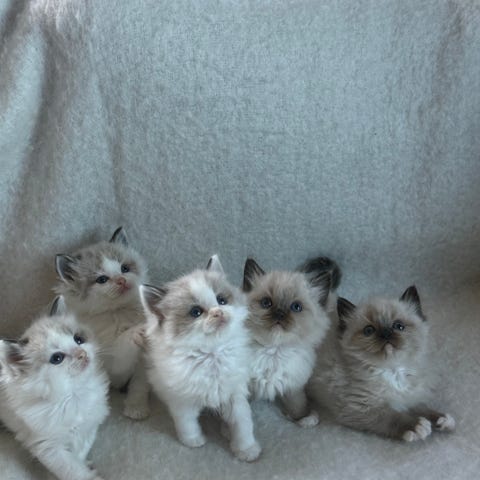 Vi har 8 otroligt fina Ragdoll-kattungar som nu är 5 veckor gamla. De växer upp i trygg hemmiljö med mycket kärlek, omsorg och daglig socialisering.
