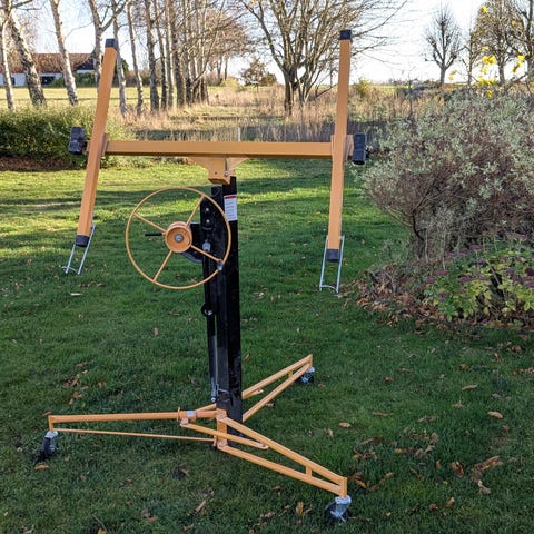 Gipshiss i röd metall. Utrustad med handvev, kedja och stativ med flera ben för stabilitet. Avsedd för lyft och montering av gipsskivor eller liknande skivmaterial i tak.