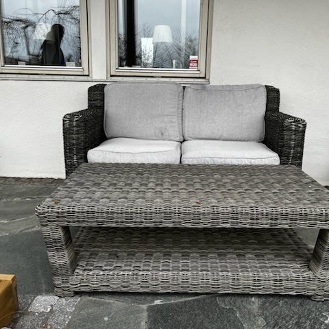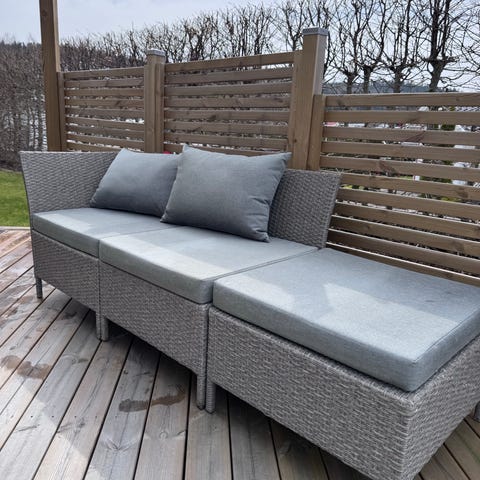 Utemöbel i form av soffa i två sektioner i konstrotting med grå sitt- och ryggdynor. Soffan har armstöd i båda ändar och raka linjer som passar på altan, uteplats eller balkong. Dynorna är i bra skick. Konstrottingen är sliten, men kommer fungera ett par säsonger till. Mått/del 78×78×78cm.