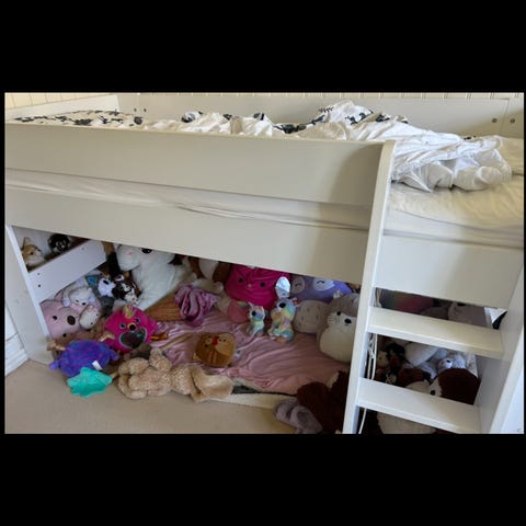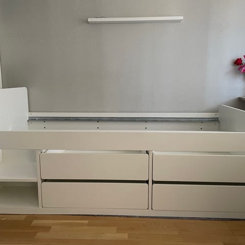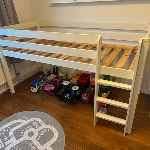 Mio loftsäng i vitmålat trä. Sängen är upphöjd med stege framtill och har skyddsräcken runt liggytan. Konstruktionen är anpassad för barn från 6 år. Passar i barnrum där man vill utnyttja golvytan under sängen till exempelvis förvaring eller lek.
