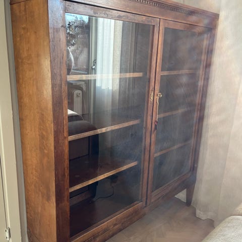 Stort bokskåp/vitrinskåp i ek, vintagestil. Helt och stabilt. Nyckel finns.