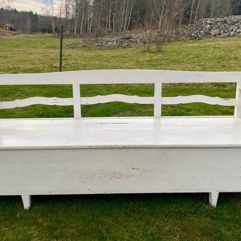 Gedigen kökssoffa i vitt med träskiva som lock.