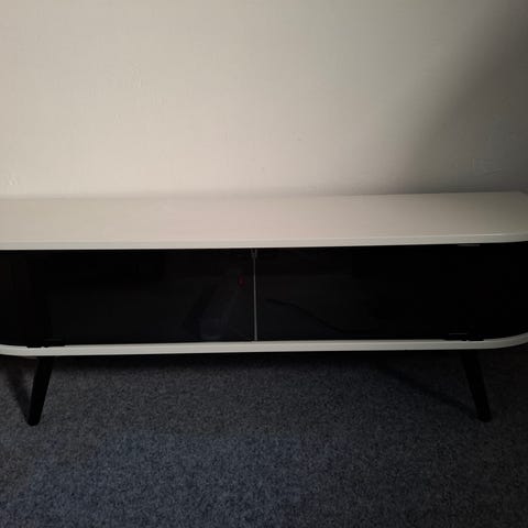 En tidlös mediabänk som kännetecknas av sin vita stomme, stilrena silverfärgade handtag och fötter sam en kontrasterande mörk toppskiva.