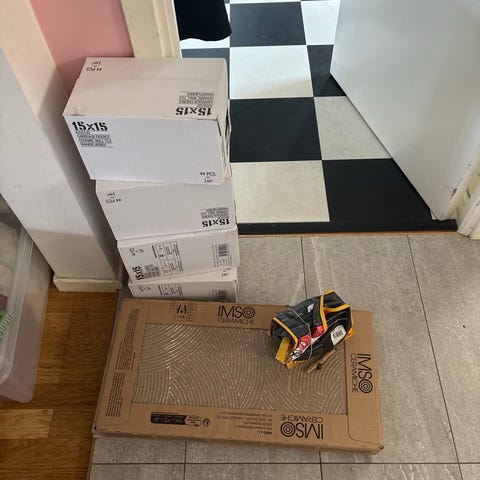 Cinca kakelplattor i originalkartonger. Plattorna är avsedda för vägg eller golv beroende på typ och kan användas i till exempel kök, badrum eller andra utrymmen inomhus. Flera kartonger ingår enligt bild.
