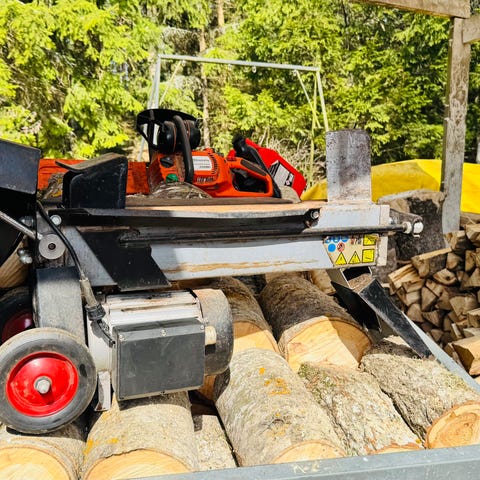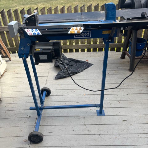 AL-KO vedklyv elektrisk på stativ. Vedklyven är eldriven och ansluts med vanlig elkontakt. Den står på ett metallstativ med hjul för enklare förflyttning och har skyddsplåtar runt arbetsområdet. Maskinen är avsedd för klyvning av ved och liknande trädetaljer i hemmamiljö eller mindre vedhantering. Alla reglage och elkomponenter sitter samlade vid sidan av klyvbädden för enkel åtkomst vid användning.