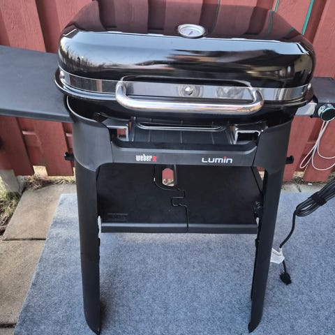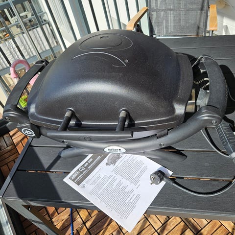 Weber Q1400 elgrill i svart utförande. Kompakt bordsmodell med lock och två sidhandtag för enkel förflyttning. Grillgaller i gjutjärn och elanslutning med integrerad temperaturreglering. Passar för balkong, uteplats eller mindre utrymmen där gas- eller kolgrill inte är möjlig. Skyddande överdrag ingår enligt bild.