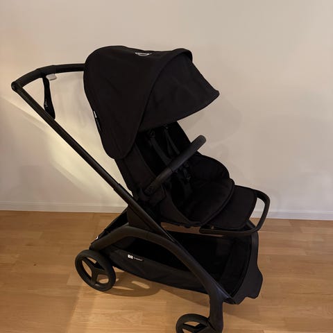 Bugaboo Dragonfly i burgundy med svart chassi. Vagnen har liggdel (ej på bild), sittdel med fempunktssele och bygel framtill. Väldigt smidig vagn! Inköpt hösten 2024.