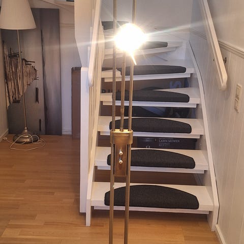 Golvlampa Isjakt från IKEA i stål. Stilren och praktisk. Riktbar läslampa på vridbar arm. Uppåtriktad lampa i toppen som lyser upp hela rummet. Båda lamporna dimbara. Inbyggda LED-lampor. Höjd 180 cm.