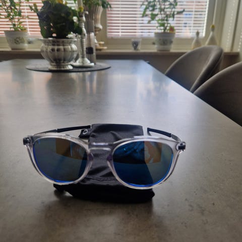 Säljer ett par Oakley Frogskins solglasögon, unisex med transparent plastbåge och blå spegelglas. Klassisk rektangulär form med helram.