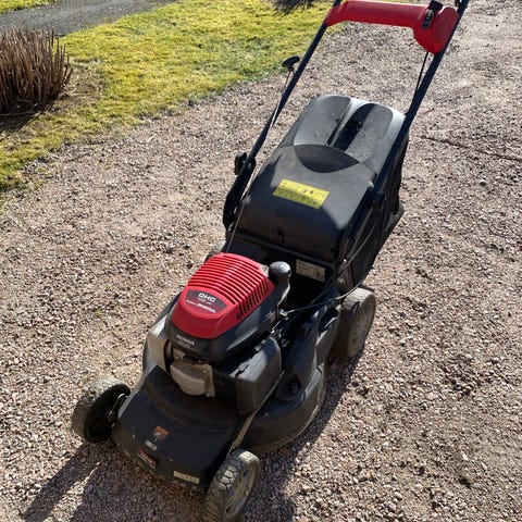 Honda Izy-On gräsklippare med batteridrift på 36V. Modellen har fyrhjulskonstruktion och uppsamlare baktill med Honda-logotyp. Klipparen är avsedd för gräsmatta och lämpar sig för privat trädgårdsbruk. Batteri och laddare syns på bilderna. Färgkombination i huvudsak grå, röd och svart med beige uppsamlare. Någon som har stor ytor 2 st batteri ingår 36v 4.0ah