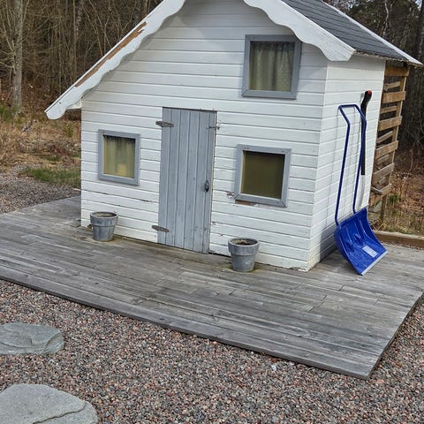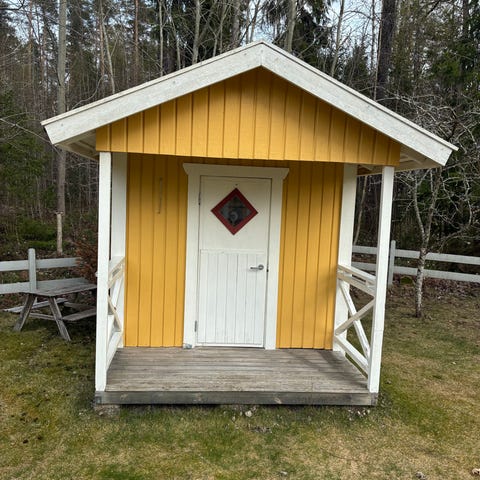 Lekstuga som lekts mycket med och behöver en hel del kärlek. ”Verandan” är rutten och behöver bytas ut. En del fläckar inuti på väggarna och tak. Behöver delvis målas.