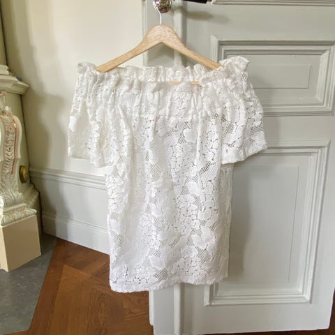 Cremevita jeans i rak modell och hög/medelhög midja. Uppvikta benslut (som kan vikas ner) med rå kant. Storlek 34 men passar även en 32:a.