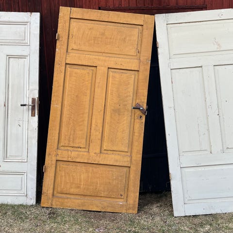 Innerdörr i trä med karm. Dörren har slät yta och är försedd med handtag. Passar som innerdörr i bostad eller förråd där en enkel trädörr önskas.
