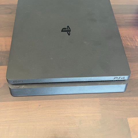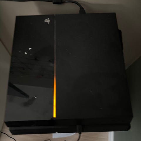 Sony Playstation 4 spelkonsol i svart färg. Standardmodellen av PS4 med HDMI‑utgång, nätverksanslutning och USB‑portar på baksidan. Lämplig för spel, film och streamingtjänster. Stöd för trådlösa handkontroller och anslutning till TV eller bildskärm via HDMI. Fungerar men fläkten går på max hela tiden. Ingen kontroll ingår. En konsoll för den händige.