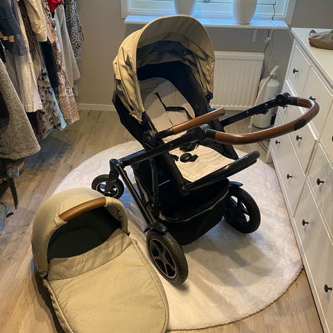 En komplett barnvagn som säljes med ligg + sittdel. Perfekt från nyfödd upp till större barn då både liggdel och sittdel ingår. Vagnen är väl använd, vilket syns, det finns slitage som repor på chassit och tecken på användning i tyget. Inga skador eller fel, allt fungerar som det ska.