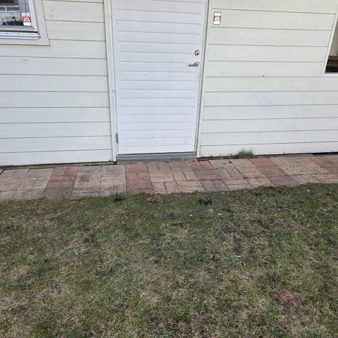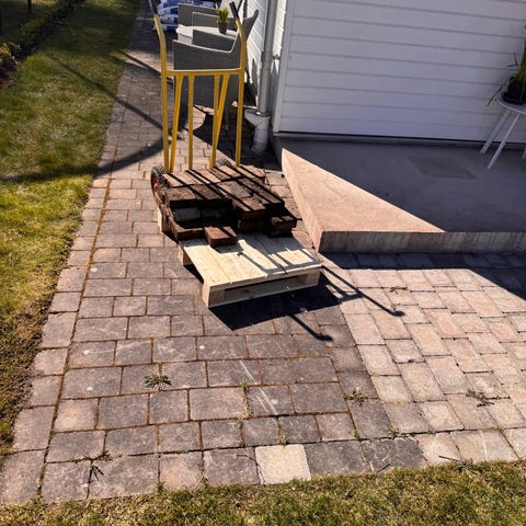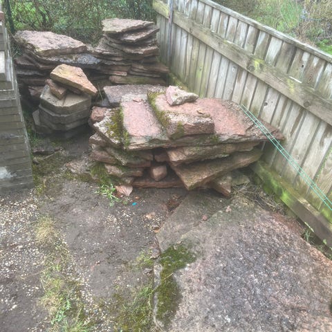 Betongplattor fås mot upphämtning, en del är staplade, resten är lagd. Fås mot att man hämtar dem.