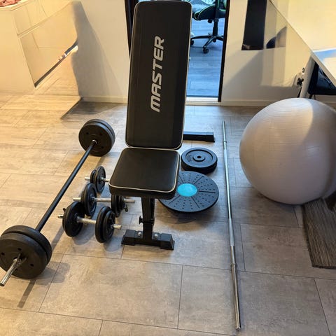 Träningsbänk med skivstång och vikter