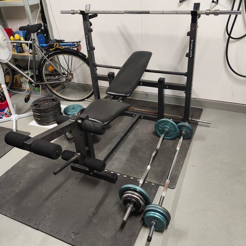 Ställbar bänk och ställbart rack. Olympisk skivstång 15 kg samt en skivstång för curl. Medföljande vikter om totalt 60 kg.