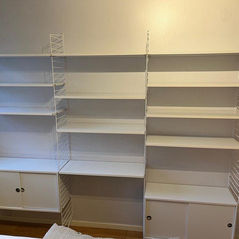 Säljer två stycken hyllplan från String Furniture i vacker valnöt. Perfekta för att komplettera din befintliga hylla eller för att bygga en ny sektion tillsammans med gavlar.