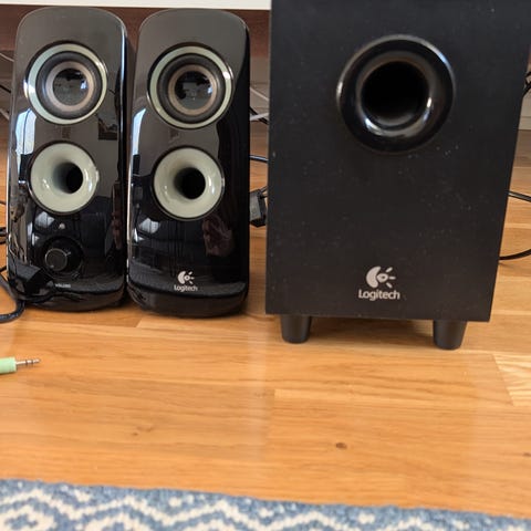 Logitech Z-2300 THX certifierad högtalarset med subwoofer, total RMS power 200 watt. Systemet består av två mindre högtalare och en större subwooferenhet. På framsidan finns en kontrollenhet med ratt för volym och anslutningar för ljud. Högtalarna är avsedda för användning med dator, laptop eller annan ljudkälla med kompatibel anslutning. Passar för uppspelning av musik, film och annat ljud i hemmiljö.
