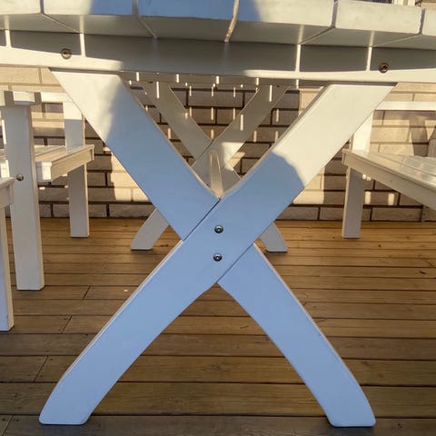 Trädgårdsgrupp med bord, två fåtöljer och två bänkar i vitmålat trä. Bordet har rektangulär skiva med ribbor och kryssben. Stolar och bänkar har ribbad sits och ryggstöd med lätt rundad överkant. Passar för utomhusbruk i trädgård, på altan eller uteplats. Gruppens utformning ger plats för flera sittande runt bordet.