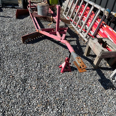 Traktorpall / lastpall i trä med röd stålramskonstruktion. Lastytan består av träbrädor monterade i en rektangulär ram. På baksidan finns fastsvetsat fäste för montering i trepunktslyft eller liknande på traktor eller maskin. Lämplig som lastplattform för transport av material på gård eller mark.