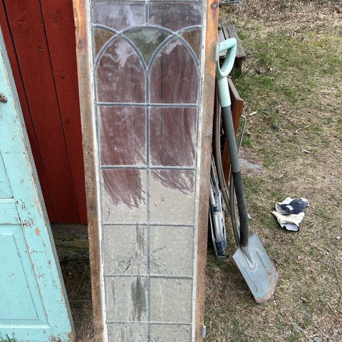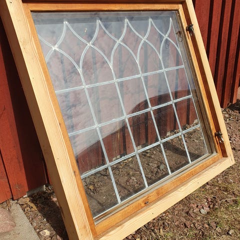 Fönster med blyinfattat färgat glas utan en träkarm. Glaset är indelat i flera sektioner med bågformade rutor i olika färger, bland annat grönt, lila och klart glas. Karmen är i trä med synliga beslag. Passar exempelvis som dekorativt innanfönster, inslag i vägg eller som inredningsdetalj i hem, uterum eller liknande miljöer.