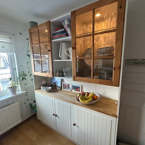Skänk/vitrinskåp från IKEA. Säljes pga köksrenovering. I mycket gott skick. Belysning finns i skåpet. Höjd 1,08m Bredd 1,25m Djup 38 cm