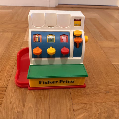 Fisher-Price leksaksgarage i plast med flera våningar och ramper.