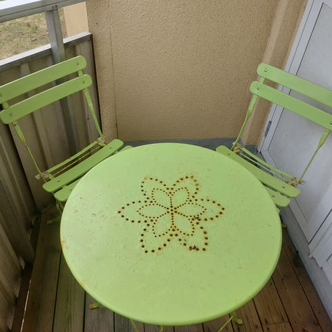 Trädgårdsmöbler bestående av ett rektangulärt matbord och flera stolar i trä. Bordet är hopfällbart med ribbad bordsskiva och hål i mitten för parasoll. Stolarna är ribbade trädgårdsstolar med lutad rygg, anpassade för utomhusbruk. Passar som utemöbler på altan, balkong eller i trädgård.
