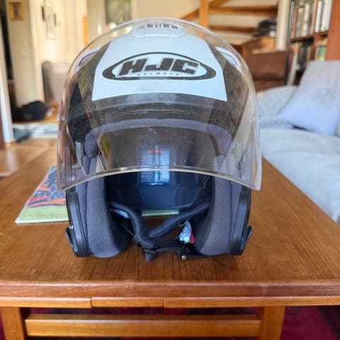 Nolan Classic Plus öppen mc-hjälm i silverfärg, storlek S. Hjälmen har klart visir som täcker ansiktet och ventilationsöppningar upptill och på sidorna. Invändigt finns vadderade öron- och kindkuddar samt hakrem med snabbspänne. Passar för motorcykel- eller mopedkörning där öppen hjälm önskas.