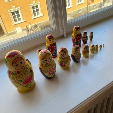 Rysk matryoshka, set med fem trädockor i olika storlekar. Dockorna är handmålade i rött med blommönster och ansikten på framsidan. Tillverkade i trä där varje mindre docka ryms inuti en större. Passar som prydnad eller samlarföremål.