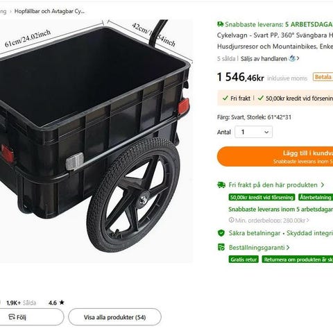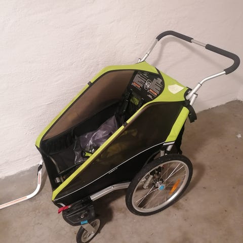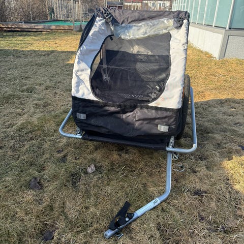 Cykelvagn från Biltema. Enkel att koppla på och av.