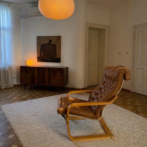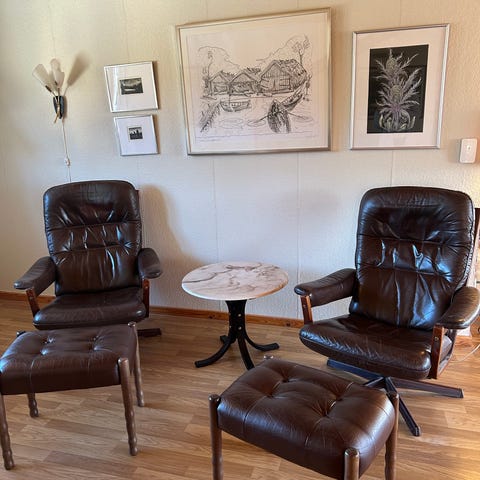 Höjd på den höga delen 35 cm, och på den låga 30 cm. Omklädd (ej professionellt) i fårskinn (ej äkta). Bra skick, hittar inget att anmärka på, katt finns i hemmet men har hållits ifrån denna möbel.