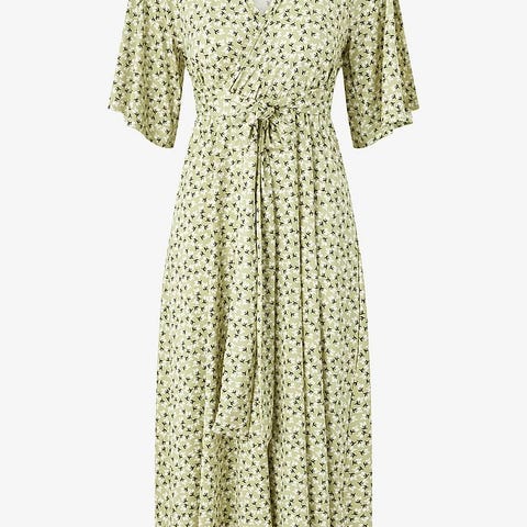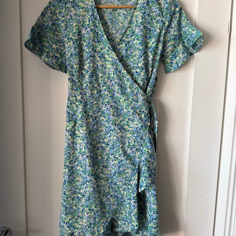 Vero Moda sommarklänning för dam i storlek XS. Klänningen är i omlottmodell med knytband i midjan och korta ärmar. Flerfärgat blommigt mönster på ljus botten. Tillverkad i polyester med volangkant nedtill.