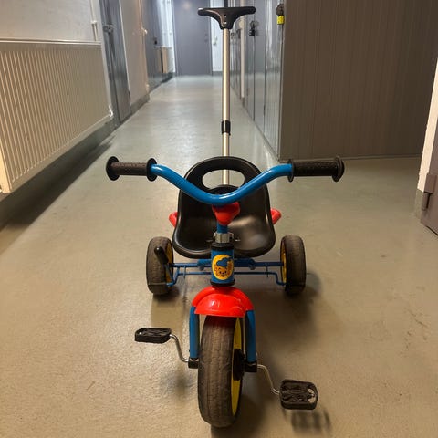 Pyjamashjältarna trehjuling med skjutstång i blå, gröna och röda färger. Trehjulingen har motiv med karaktärerna från Pyjamashjältarna framtill, plastpedaler och sits i plast. Utrustad med avtagbar skjutstång med handtag så att en vuxen kan styra och skjuta på. Bak finns en plastbalja för att transportera leksaker eller andra småsaker. Lämplig som första cykel för mindre barn som vill träna balans och trampning under uppsikt av vuxen.