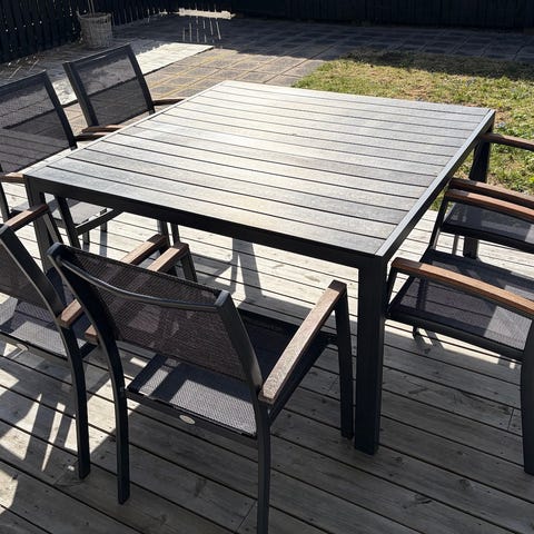 Matgrupp för utomhusbruk bestående av ett rektangulärt vitt bord och flera stolar med armstöd. Bordet har ribbad bordsskiva och är placerat på en altan/uteplats. Stolarna är vita med korsmönstrad rygg och mörka sittdynor. Passar för matplats på altan, balkong eller trädgård. Materialet är målat trä eller i utomhusmaterial. Gruppens storlek lämpar sig för 6-8 personer runt bordet.